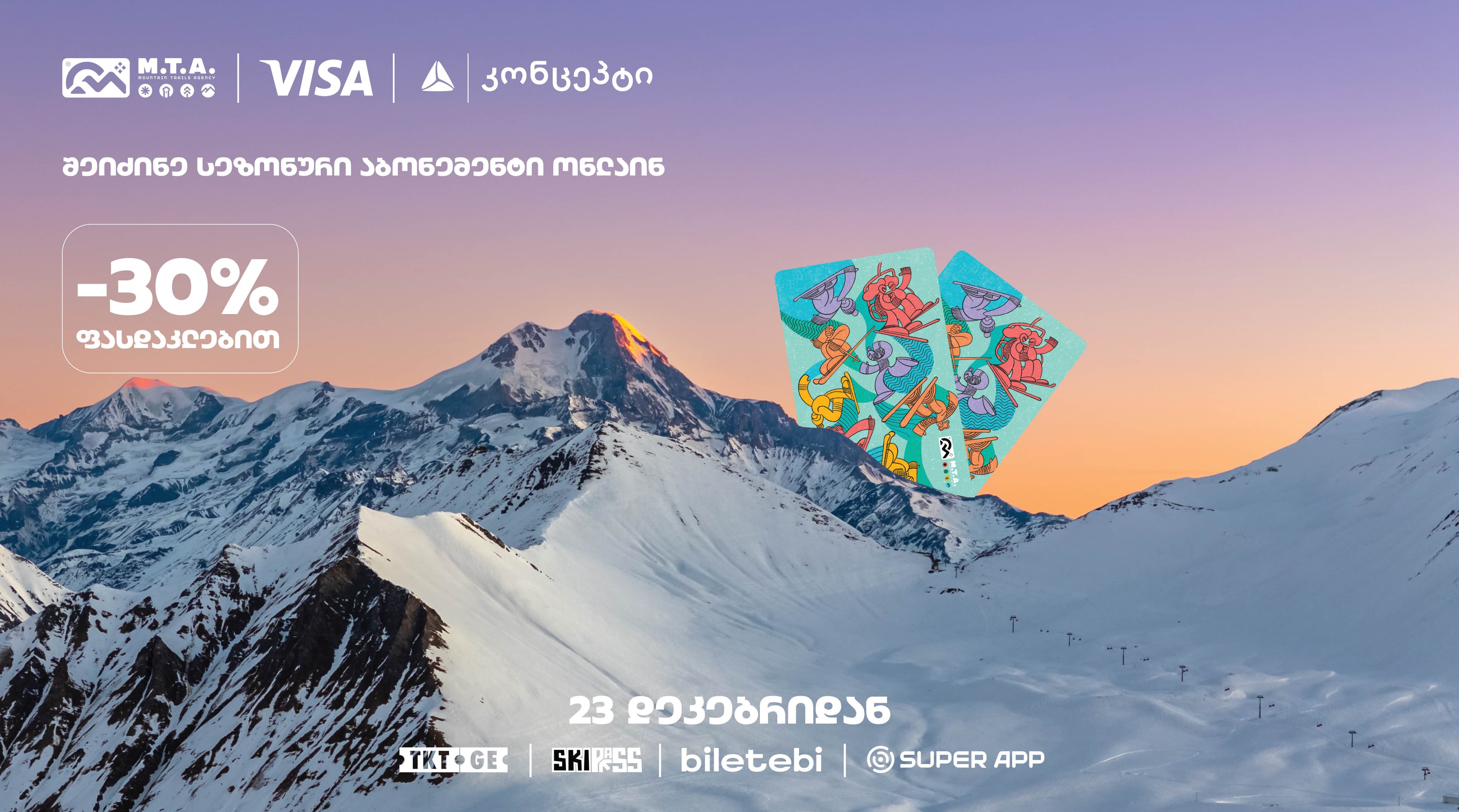 Starting December 23, when paying with Visa debit cards, you can purchase seasonal MultiSki passes with a 30% discount, exclusively on our partner online platforms: SKIPASS.GE | Biletebi.ge | TKT.GE | SuperApp